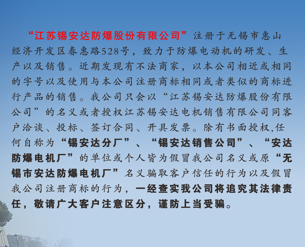 江蘇錫安達防爆股份有限公司由無錫市安達防爆電機廠和江蘇安達防爆機電集團有限公司組建而成,從1986年起開始生產(chǎn)防爆電機,是首批獲得全國工業(yè)產(chǎn)品生產(chǎn)許可證的防爆電機企業(yè)。